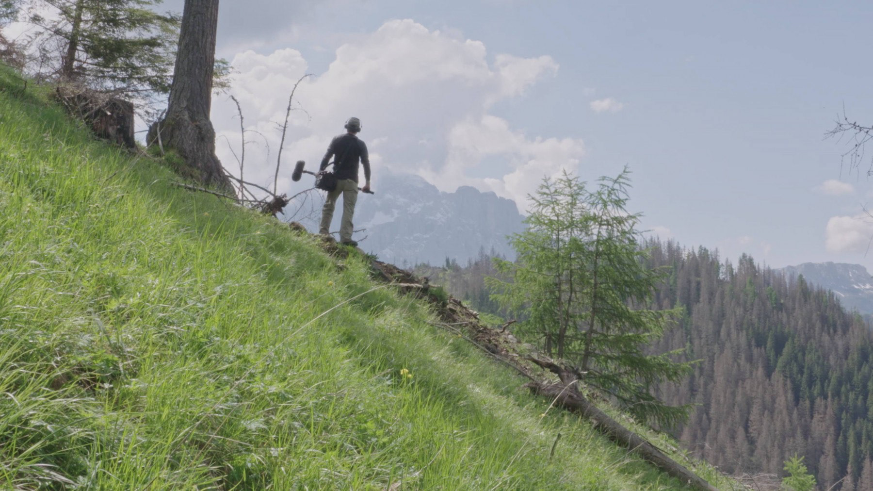 Amidst the wreckage of a ghost forest, a man appears. A sound recordist, judging by his equipment. With every step, he raises his microphone to the sky: he is seeking the voices of a new rebirth.